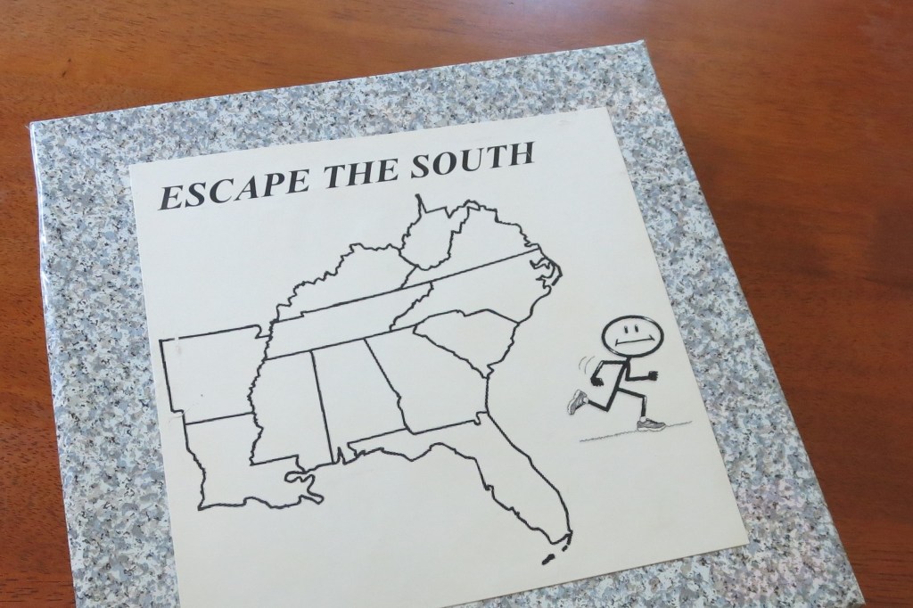 To win the game, you have to collect a trivia card of each color by correctly answering the question, then navigate your way to the “off ramp” where you must name all of the states in the South-East section of the United States. The game is played with a single six sided die, and up to four players.