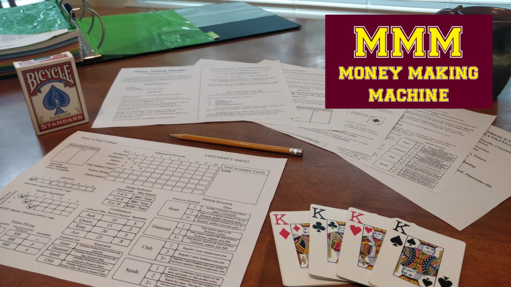 Money Making Machine is a satirical card game where you manage the University of your dreams, rob your students of all their wealth, and steal your professors’ research for your own! Money Making Machine only requires a standard deck of cards to cheat your way to the #1 spot in the Princeton Review!